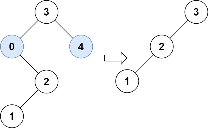 输入:root = [3,0,4,null,2,null,null,1], low = 1, high = 3