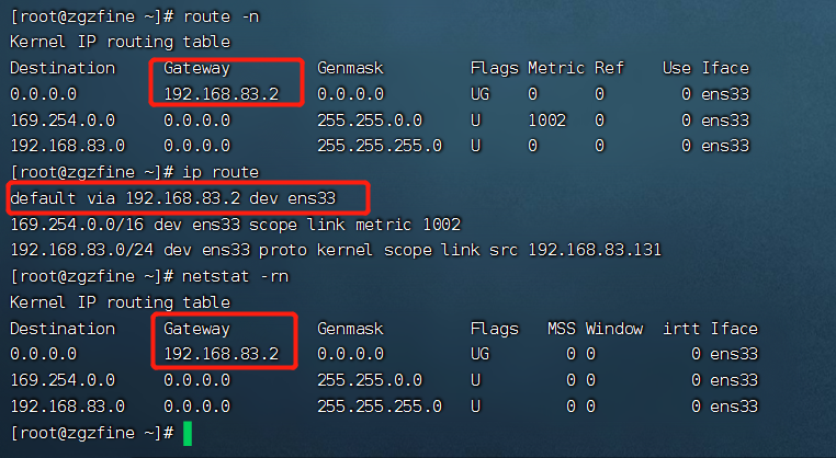 route -n 或 ip route 或 netstat -rn